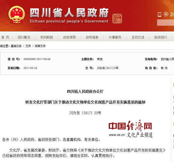 四川省人民政府办公厅转发文化厅等部门关于推动文化文物单位文化创意产品开发实施意见的通知