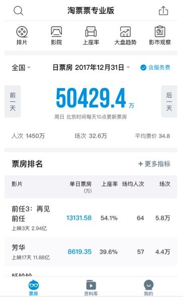 单日票房是电影行业判断市场是否进入观影高峰期的重要指标。据淘票票专业版数据显示,2017年12月31日,国内电影单日票房达到5.0429亿元,这一指标上一次超过5亿元还是8月6日,当天仅《战狼2》一部影片就贡献了4.26亿元票房。