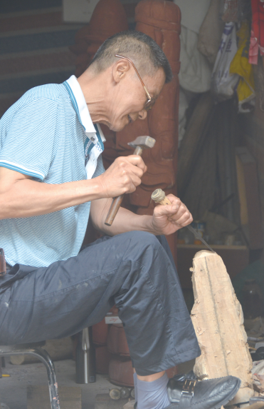 今年70 多岁的冯以儒是巴州区曾口镇人,近几年才搬到巴城居住。1978 年从部队退伍回来后,便在家务农,开始是一名石匠,后来师从巴州区平梁乡著名的木刻匠人董全忠。1984 年,正在修建的南龛坡公园召集能工巧匠,得知消息的冯以儒便和师傅董全忠等进入南龛坡,主要负责里面的狮子雕刻等工程。